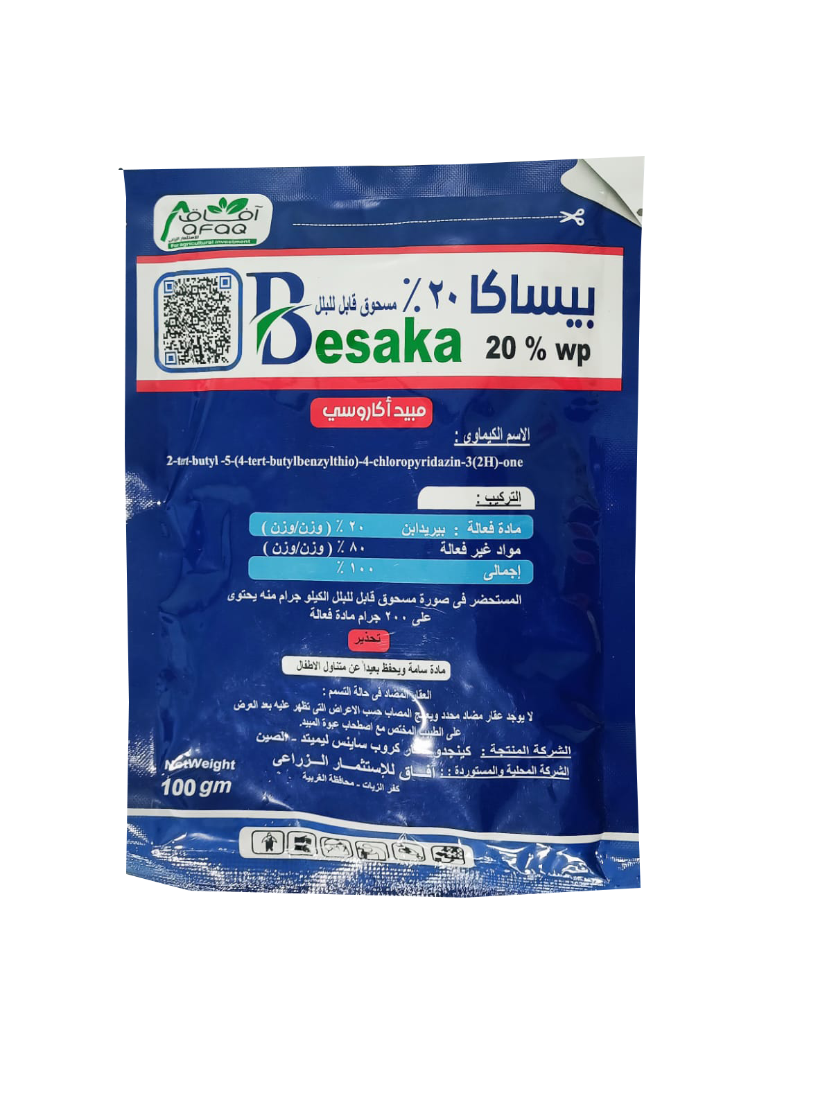 بيساكا 20 % (مسحوق قابل للبلل ) مبيد اكاروسي غير جهازى يستخدم لمكافحة العنكبوت الاحمر على محصول الفراولة وذلك بمعدل 100 جرام / 100 لتر ماء .