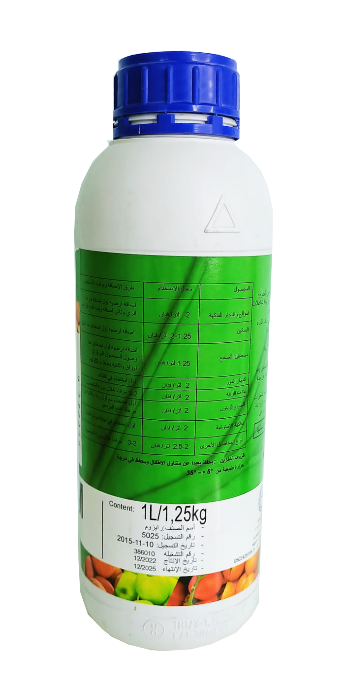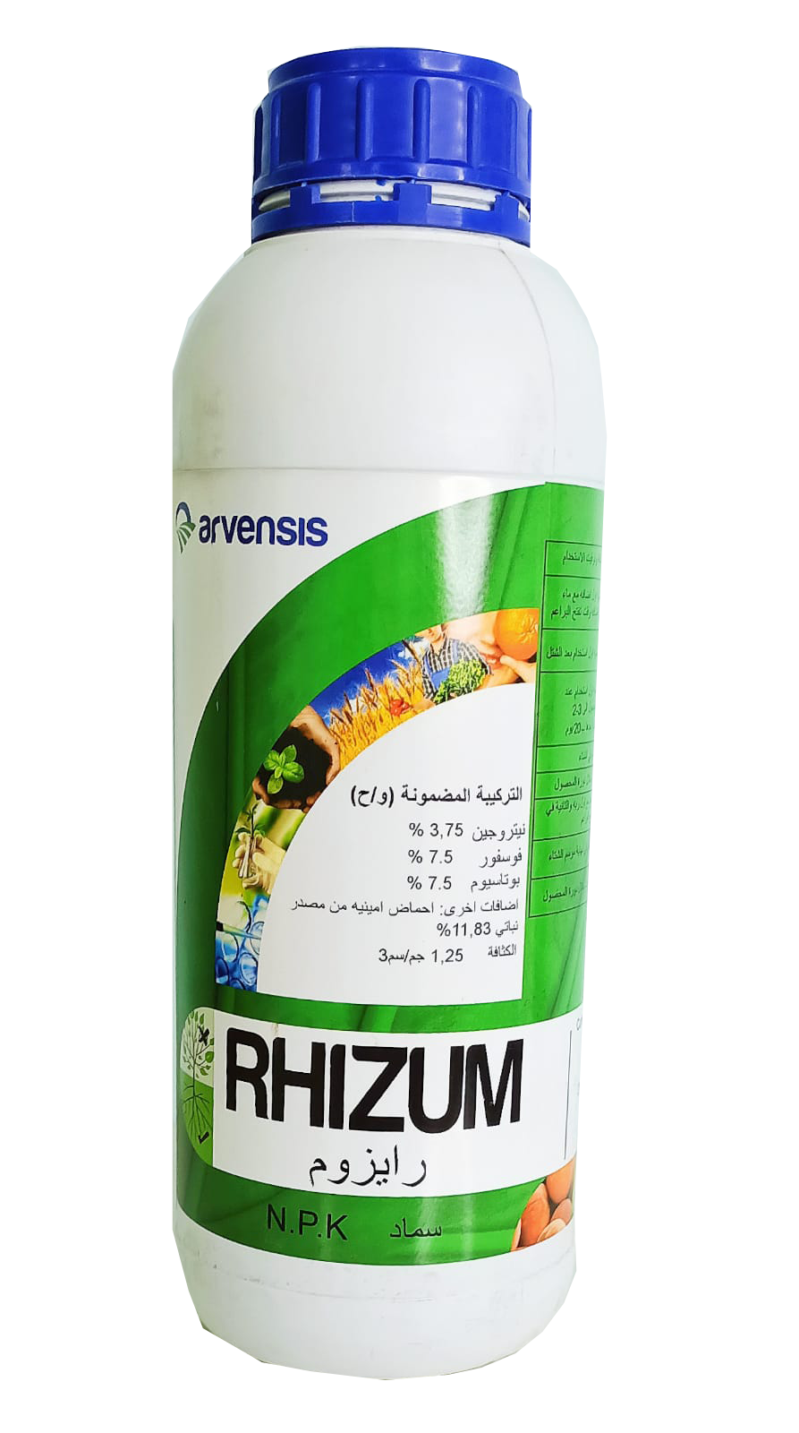 رايزوم تركيبه سائلة من النتروجينو الفسفور و البوتاسيوم وجود البوتاسيوم يسمح بزيادة حجم الثمارو زيادة المناعة ضد الامراض الفطرية يحتوى على نسبة عالية من الفوسفور مما يعمل على تنشيط الجذور و زيادة تفاعلات التسميد و تيسير امتصاص العناصر المغذية و (DNA ) امدادها للجذر الرئيسي . وجود النيتروجين اساسي للنمو الخضرى فى النبات حيث يساهم فى زيادة البناء الضوئى و يدخل فى تركيب البروتينات و الانزيمات و الاحماض النووية
