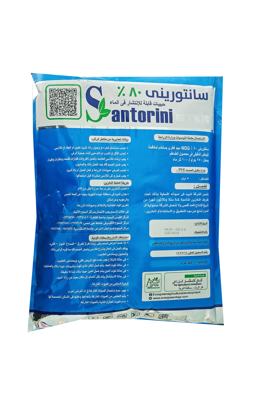 سانتورينى% 80 حبيبات قابلة للانتشار فى الماء مبيد فطرى يستخدم لمكافحة البياض الدقيقى فى محصول الطماطم بمعدل 250 جرام / 100 لتر ماء