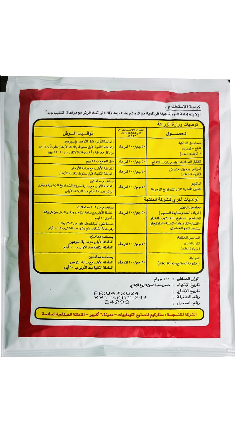 عبارة عن خليط متوازن من ثلاثة أنواع من منظمات النمو النباتية (الاوكسينات Auxins) بالإضافة الى تركيبة فريدة من الفيتامينات ومحفزات النمو الطبيعية ومضادات الأكسدة مما يؤدى الى تنشيط نمو النباتات و دفعها للتزهير و زيادة نسبة العقد وتحسين جودة الثمار مما منظم نمو نباتي متخصص لتثبيت الأزهار وزيادة نسبة عقد الثمار وتحسين نمو النبات ومقاومة الظروف البيئية السيئة مثل الصقيع والإجهاد ينعكس بدوره على رفع انتاجية وجودة المحاصيل