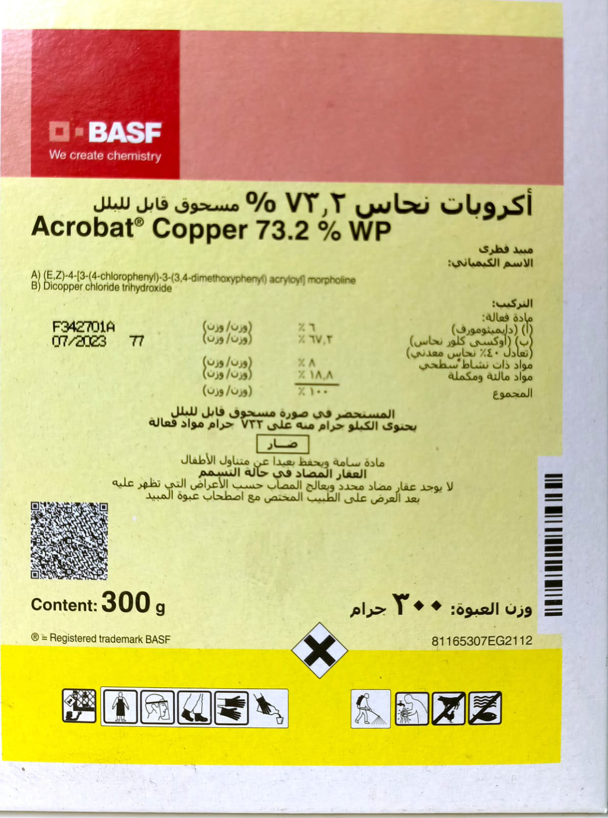 أكروبات نحاس 73.2% WP مبيد فطري وقائي علاجي عبارة عن خليط متوازن من المبيد الفطري دايميثومورف (ذو القدرة العالية على اختراق انسجة النبات) و أوكسي كلور نحاس الذي يعمل بالملامسة وهذا ما يجعل المركب يغطى ويخترق أجزاء النبات فيقاوم الفطريات داخل وخارج الأنسجة ويمنع إنتاج وإنبات الجراثيم.